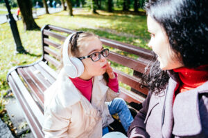 Charming caucasian mother communicating with her little girl with special needs in googles. Parent and child in park. Understanding the needs of the child. October 27, 2025 by Anne Hill