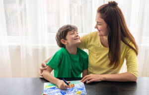 Mother and Son Drawing Together – Family Creative Time with Colorful Crayons at Home. Art therapy for children. Child psychologist, autism, ADHD. Quality time for parents and children. Copyspace